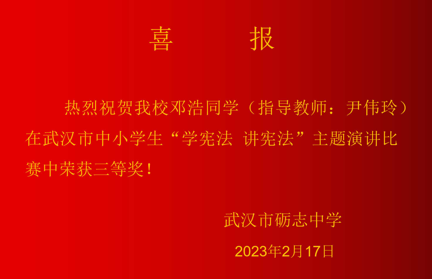 热烈祝贺我校邓浩同学(指导教师:尹伟玲)在武汉市中小学生“学宪法 讲宪法”主题演讲比赛中荣获三等奖!