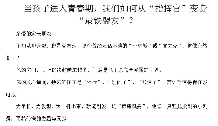 亲爱的家长朋友: 不知从哪天起,您是否发现,那个曾经无话不谈的“小棉袄”或“皮夹克”,仿佛突然变了? 他的房门,关上的次数越来越多,门后是...