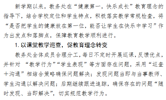 新学期以来,教务处在“健康第一,快乐成长”教育理念的指导下,结合学校定位和学生特点,积极落实教学常规检查,将“是否把学生的健康放在第一位,能否让学生在...